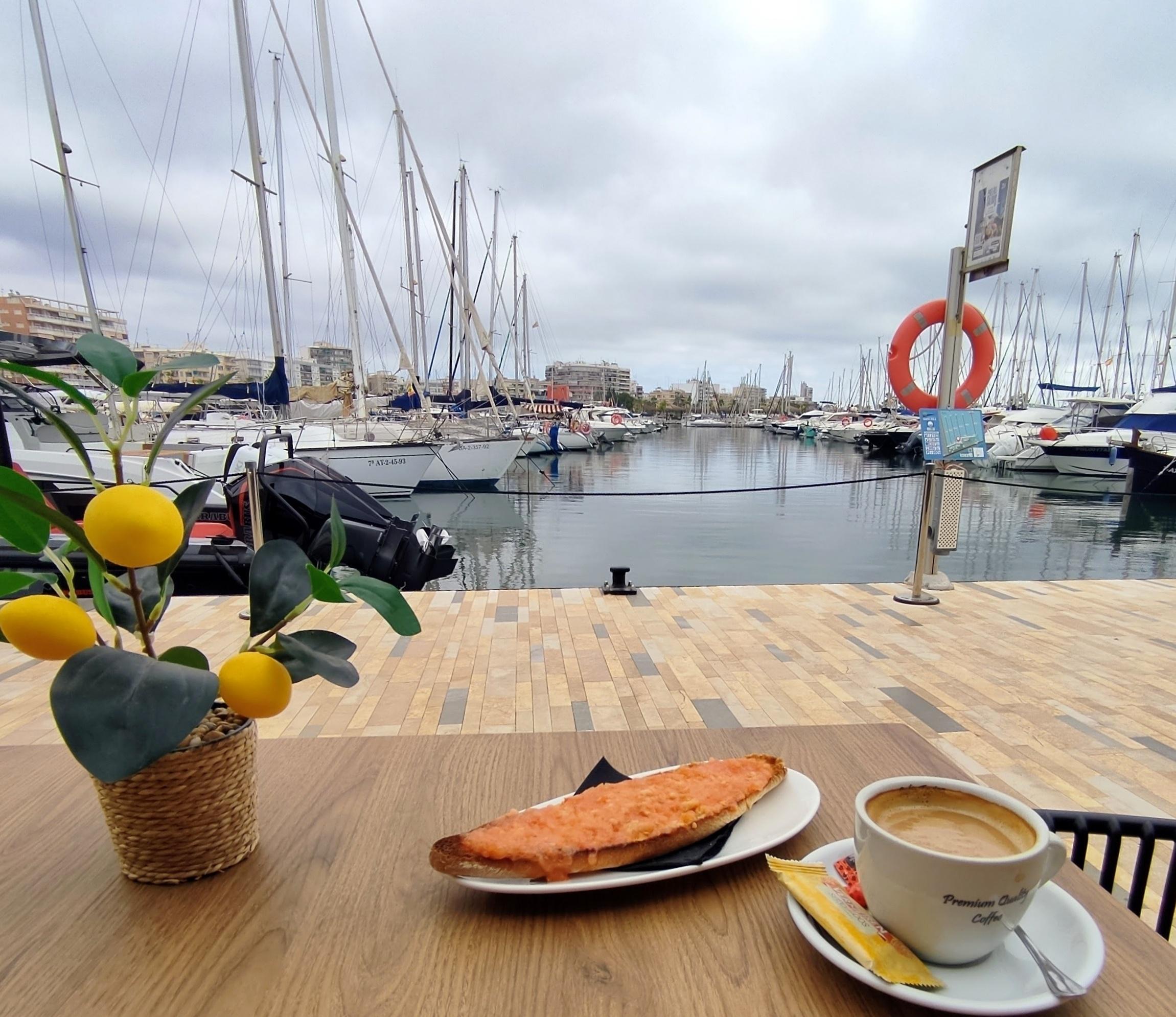 Am Hafen werde ich fündig: Aussichtsreiche Location und ein spanisches Frühstück. Toast mit Tomate und Kaffee