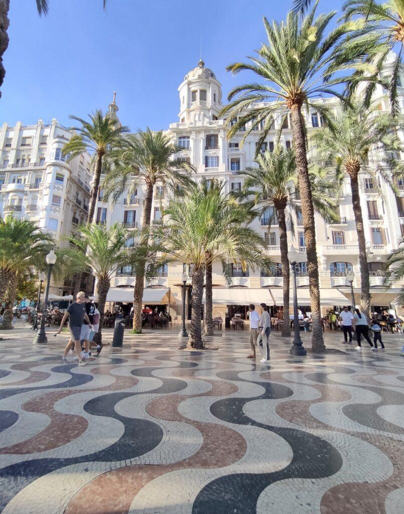 Der Flughafenbus fährt häufig. Nach 30min stehe ich schon auf der Explanada de Espana, der mosaik- geschmückten Uferpromenade Alicantes. Auf dem Weg zum Hotel gibts ein erstes Sightseeing.