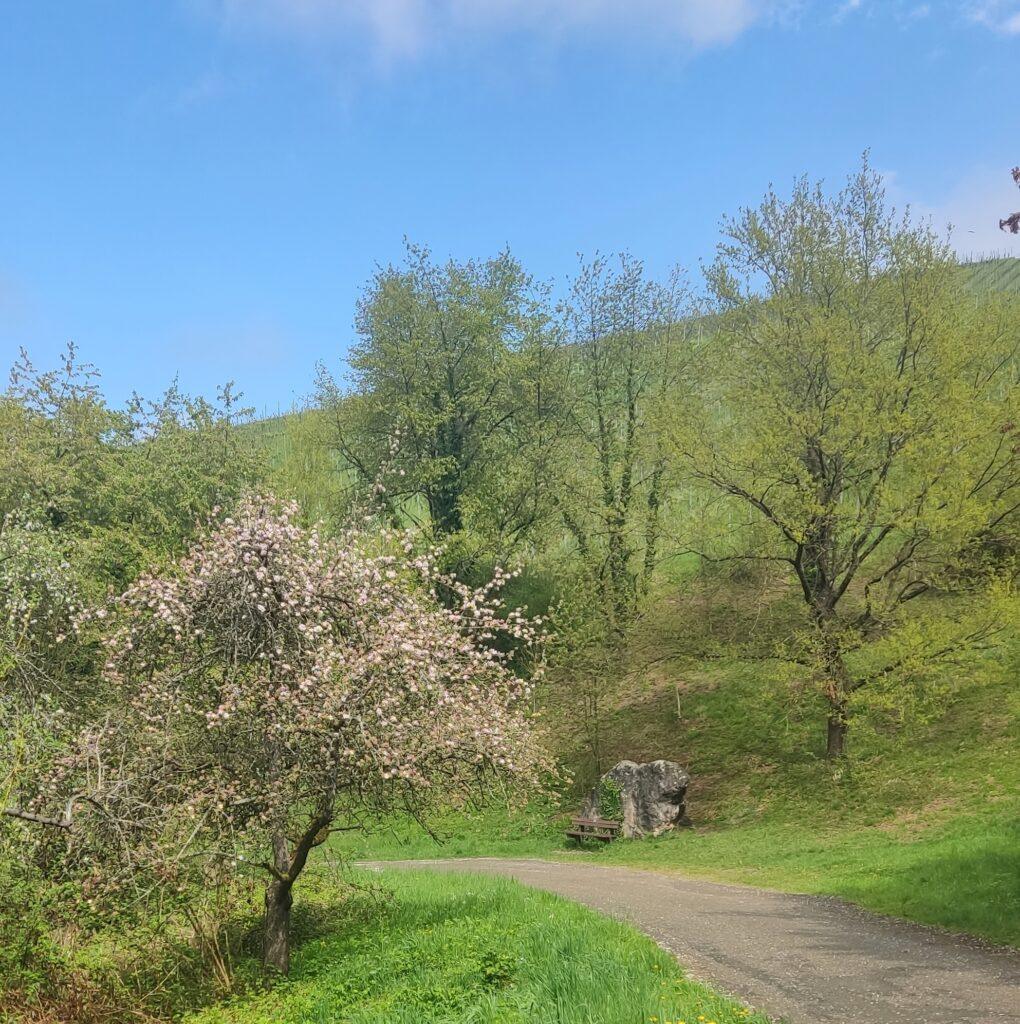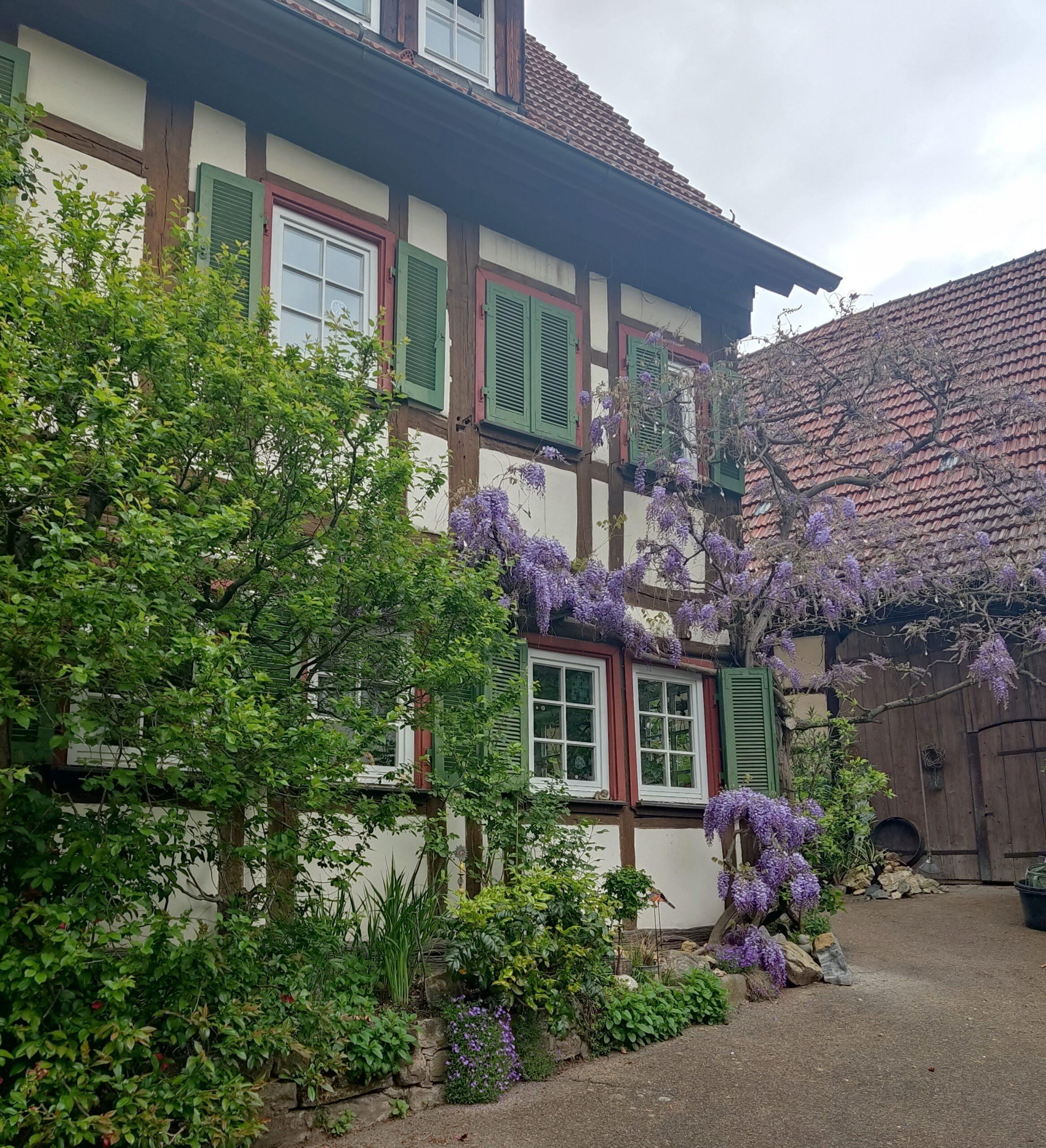 Wir sind wegen der Obstbaumblüte gekommen. Doch auch die Glyzine erfreut uns. Und die vielen Frühlingsblumen – in den Gärten, und in Wald und Wiesen