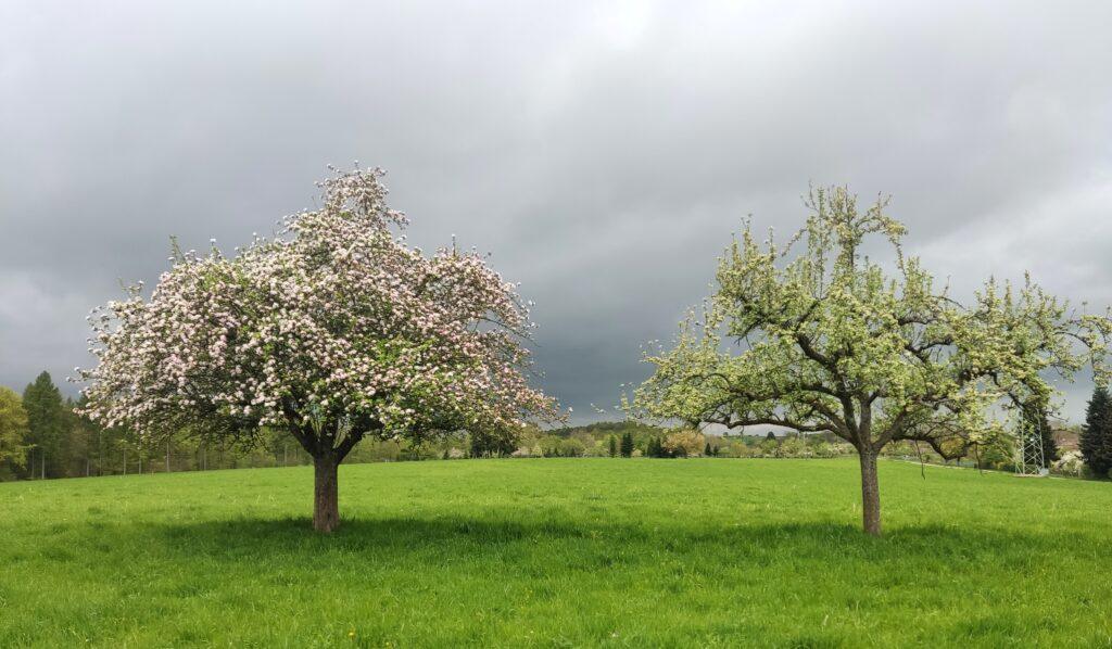 Apfel- und Birnbäume vor einem sich verdunkelnden Himmel, während unserer Mittagspause