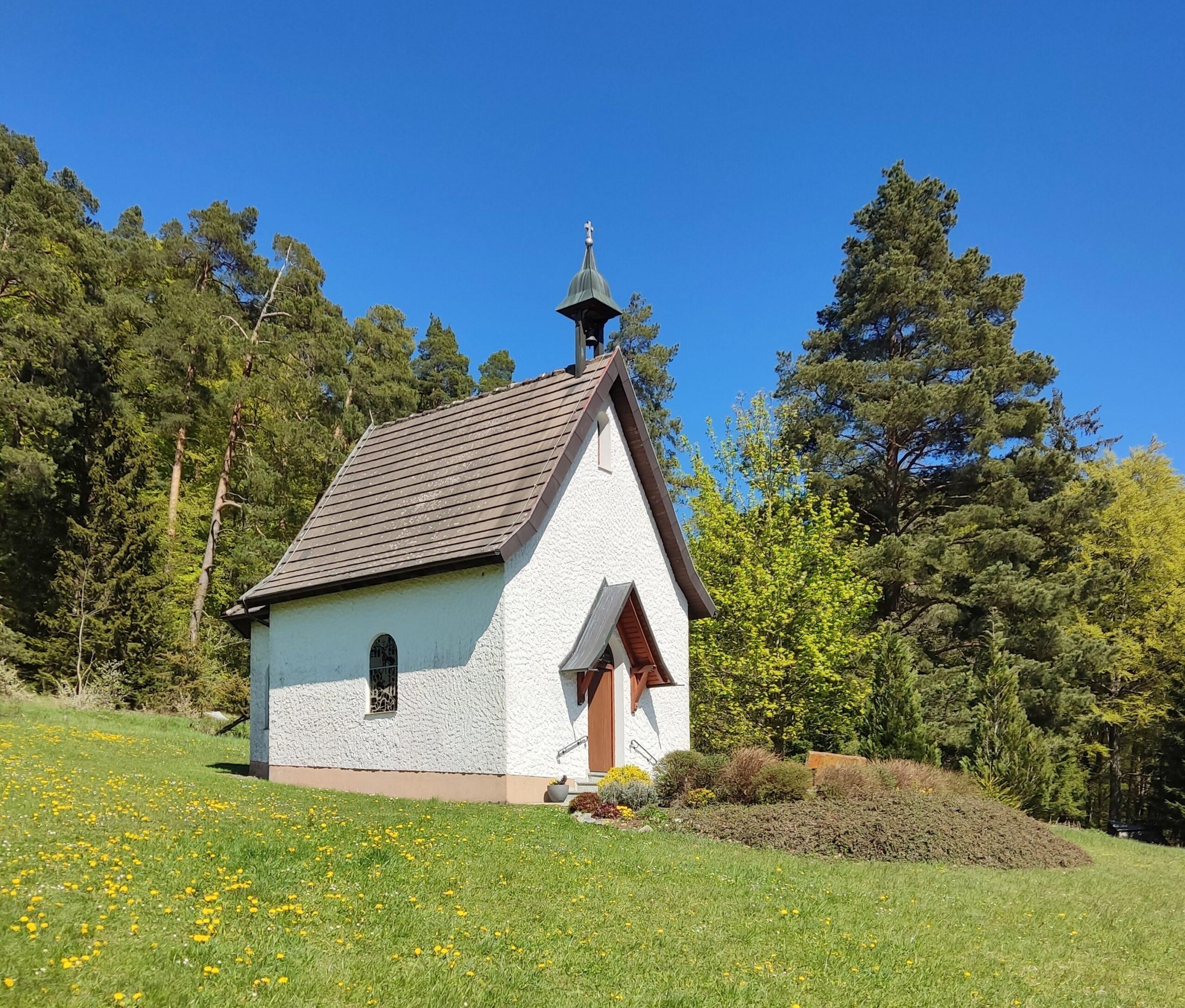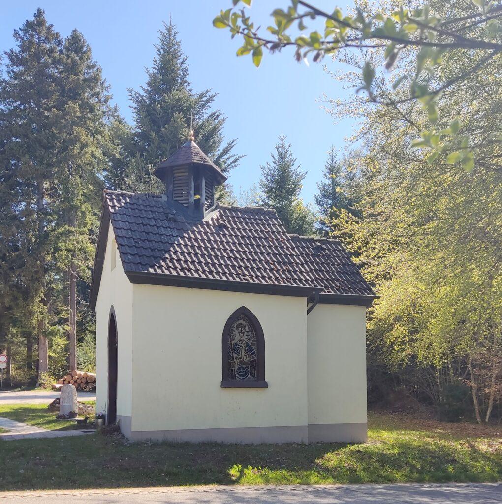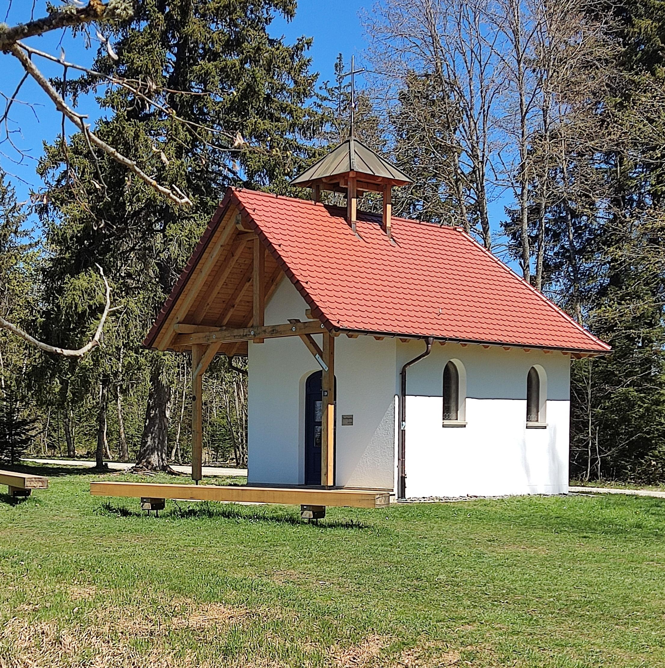 Eine Denkinger Familie stiftete die Kapelle. Sie ist für jedermann durchgehend geöffnet. Als Raum der Einkehr und Stille. Auch Kirche im Grünen wird hier abgehalten. Drumrum gibt es viel Platz zum Sitzen und Aussicht genießen. Hier findet sich auch die Gelbe Muschel des Jakobsweges als Wegzeichen.