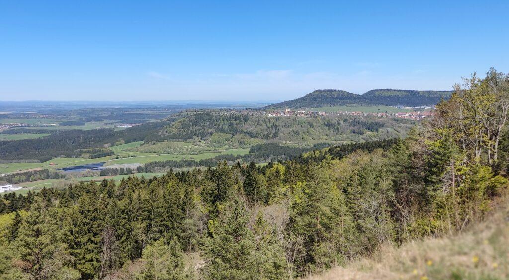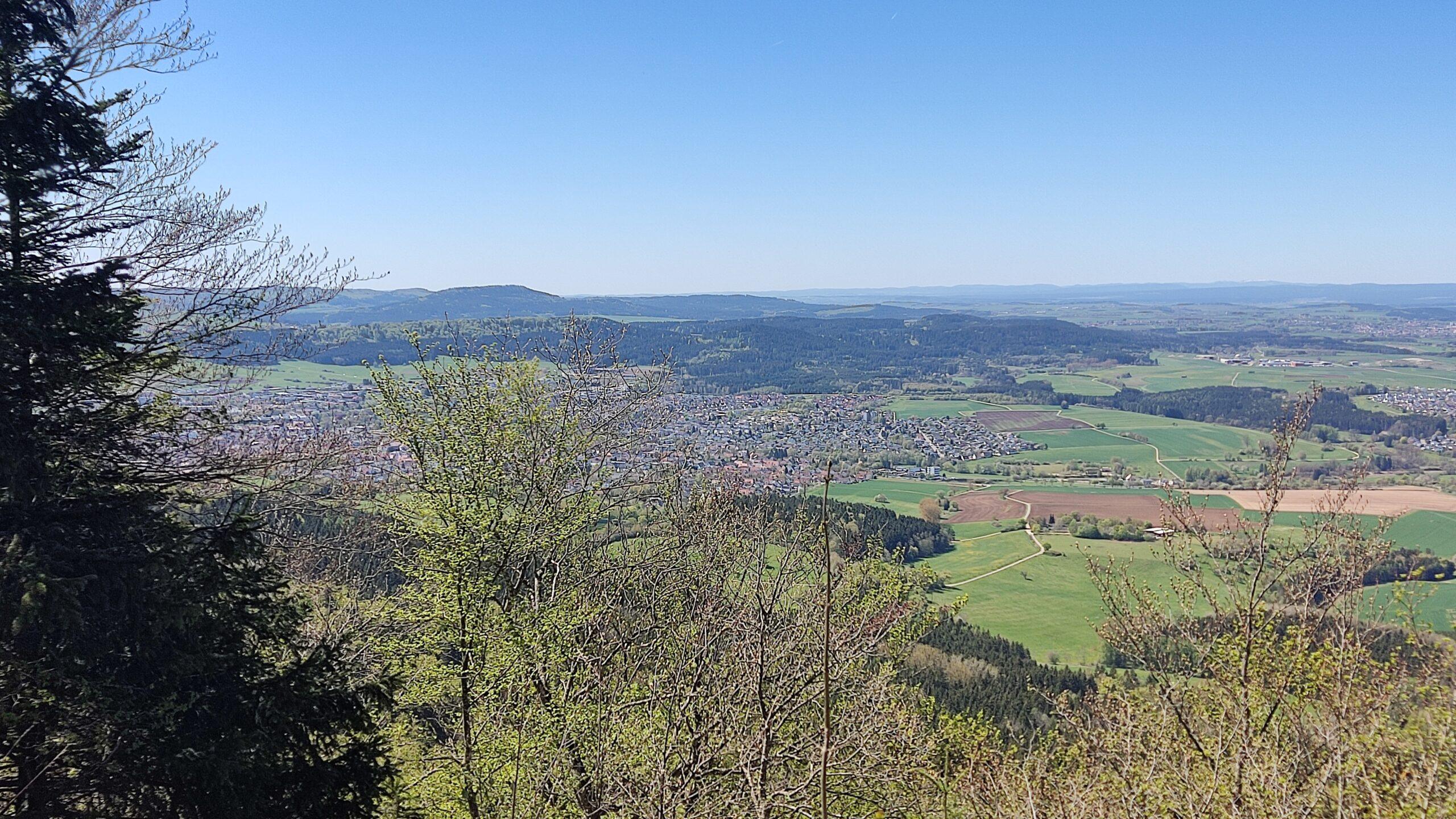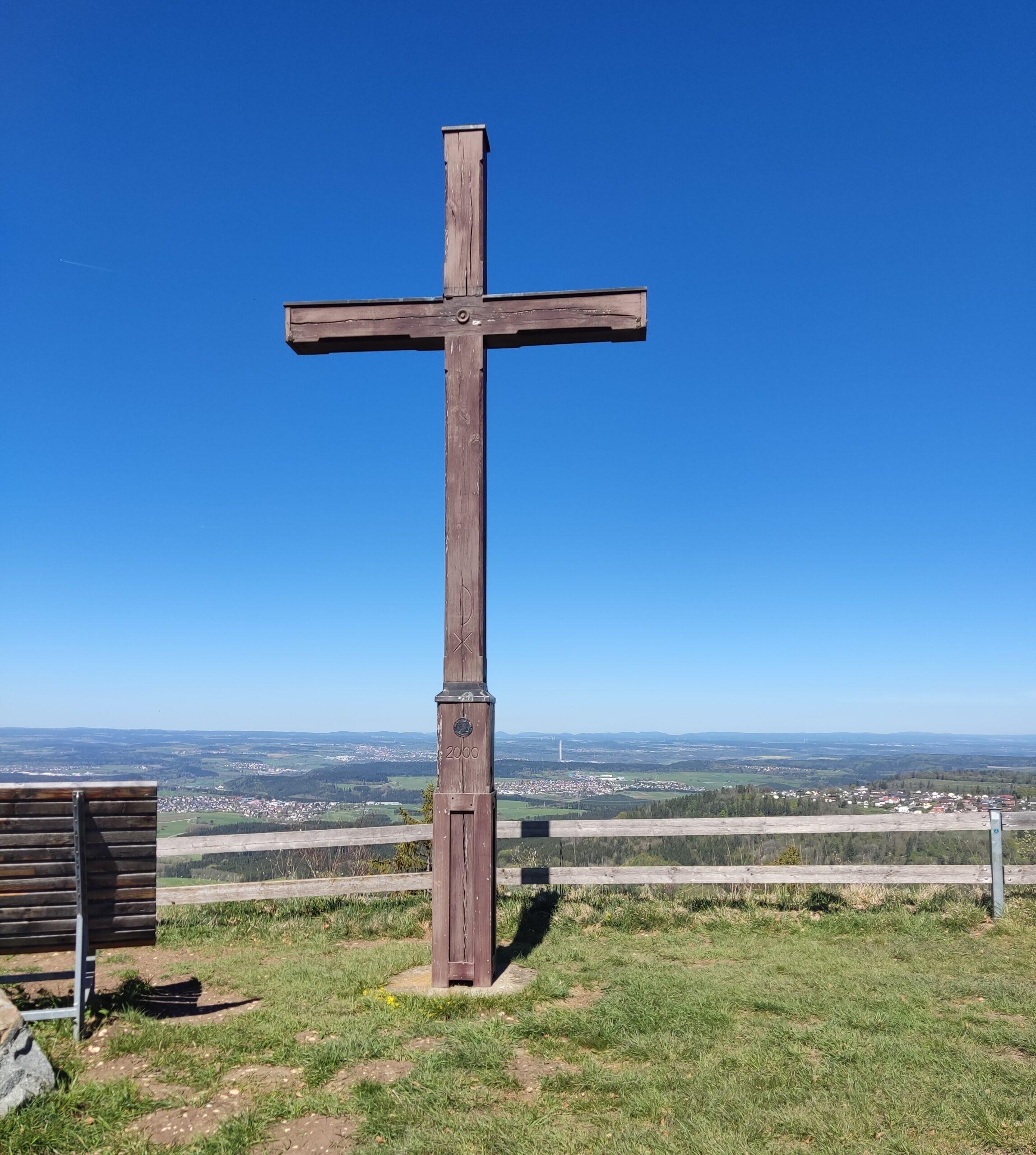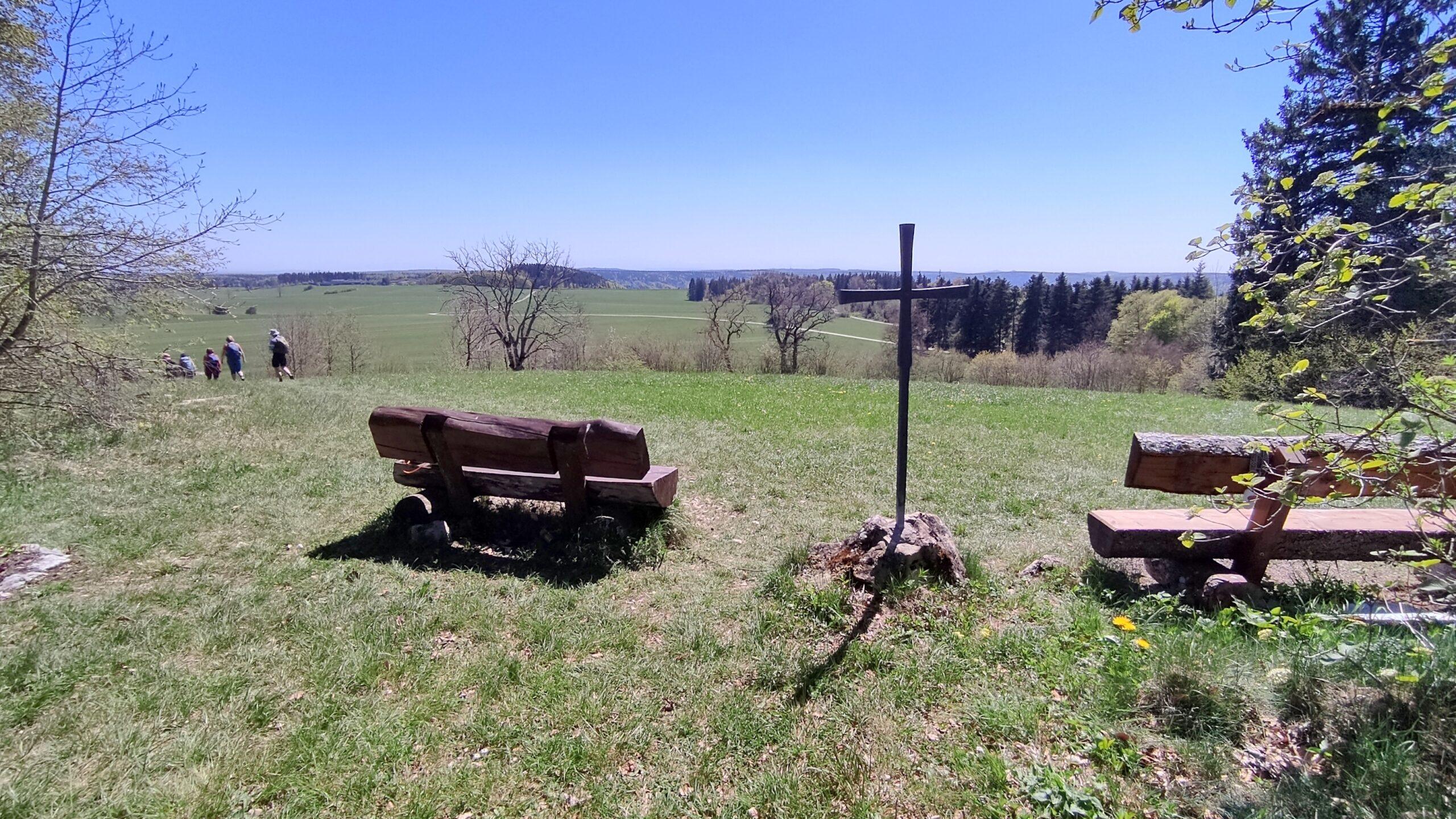Ein Kreuz aus dem Jahr 2000 steht auf aussichtsreichem Platz an der Alb-Abbruchkante. Mittig erkennt man den Turm von Rottweil