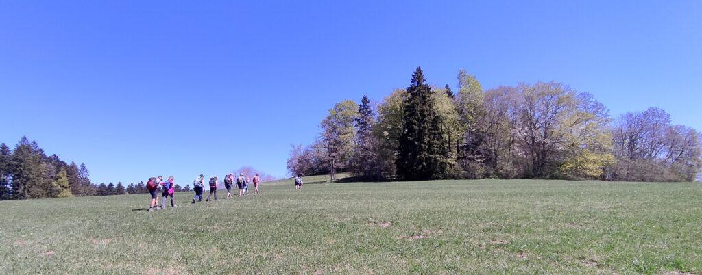 Am Hirnbühl (973m) halten wir Mittagsrast. Das unscheinbare, kleine Hügelchen bietet Sitzplätze und schöne Aussicht. Es gibt sogar ein kleines Gipfelkreuz