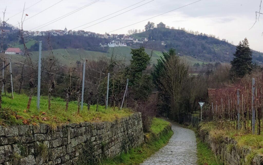 Heute ist ein kalter Wintertag. Auf dem Gras liegt noch der Raureif der Nacht. Wir wandern hinein in die Weinberge des Mönchsbergs