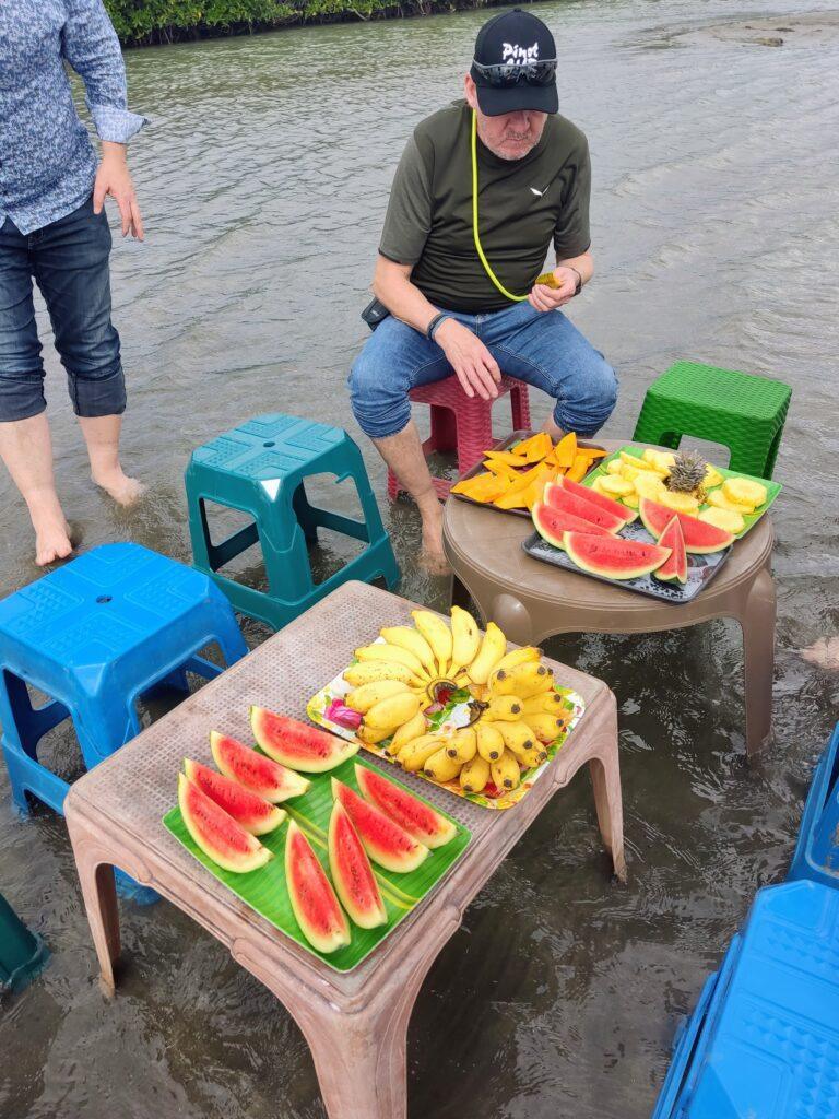 Obstreste auf unseren Booten locken Affen herbei, die uns bereits erwarten. Eine Krähe schnappt sich im Flug ein Stück Mango
