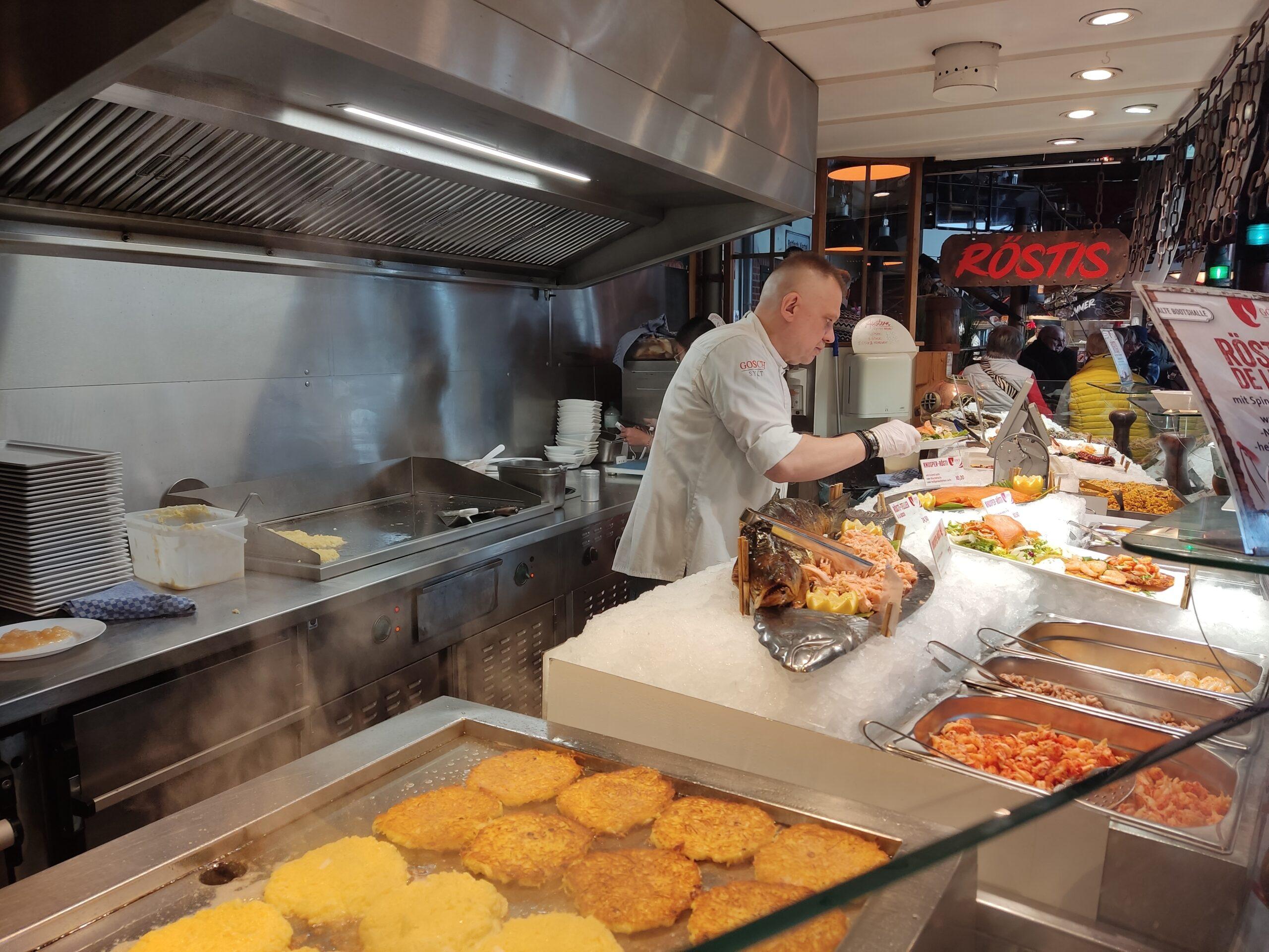 Das Essen ist ausgezeichnet, wir holen es an der Theke. Vorne, das sind Rösti – sie werden in Variationsvielfalt (Fisch oder vegetarisch) angerichtet