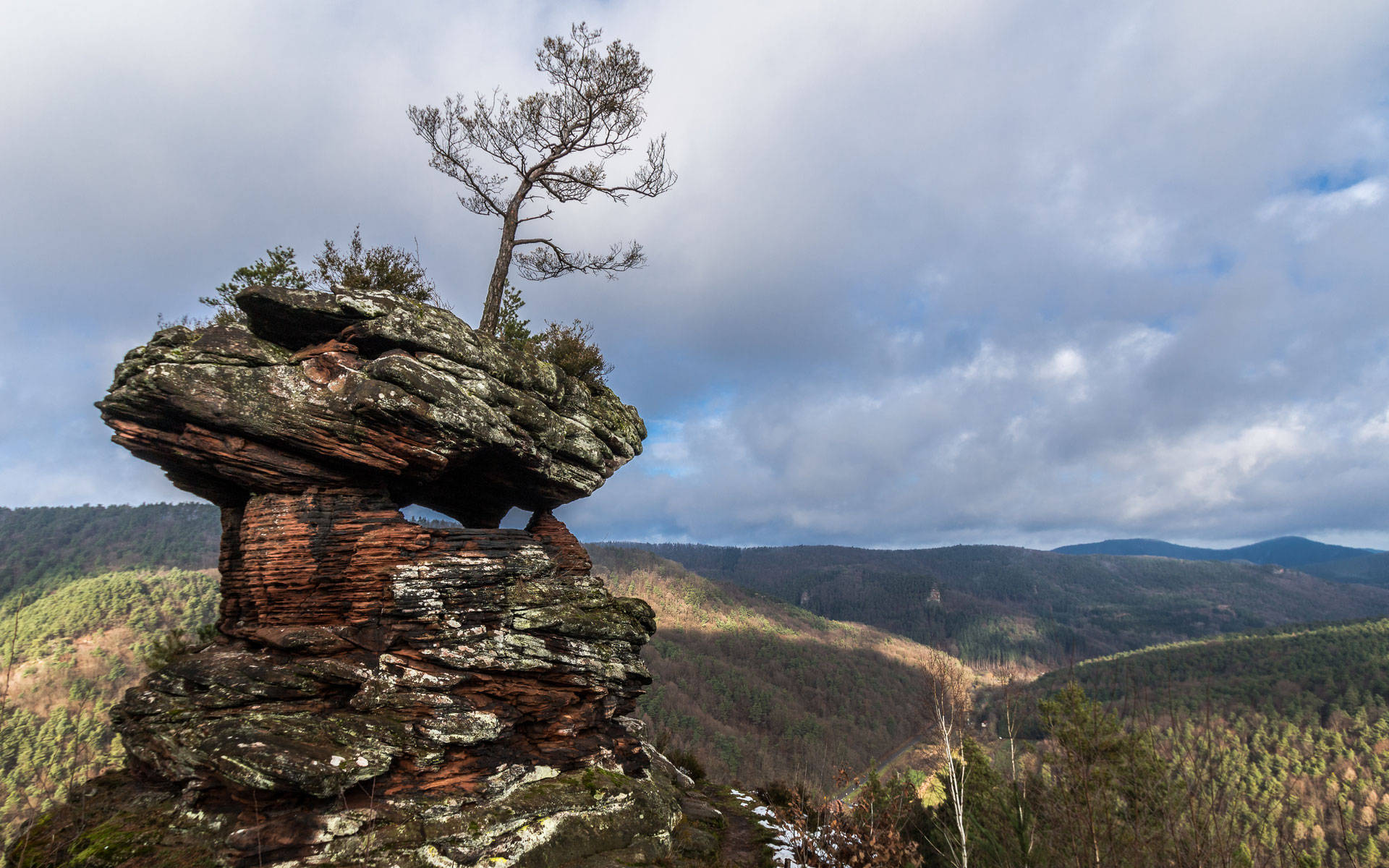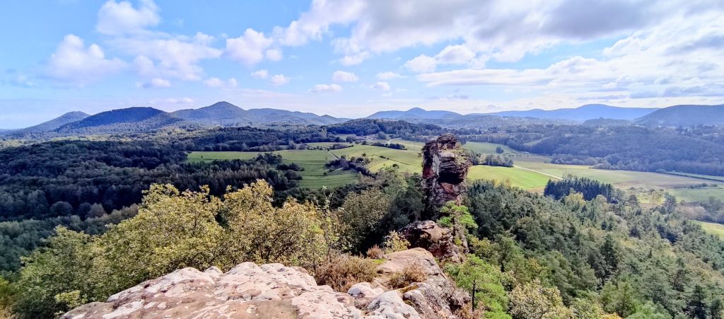 mit Aussicht auf den Süden des Pfälzerwaldes (Dahner Felsenland, das zum Wasgau gehört)